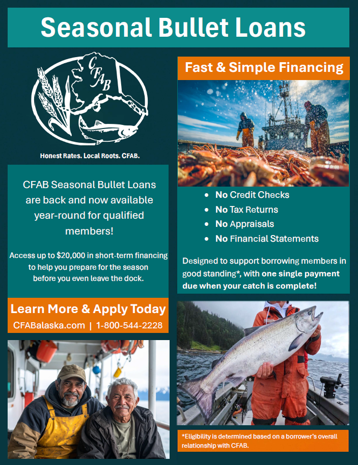 At its January 21, 2026, meeting in Juneau, CFAB’s Board of Directors approved updates to the Seasonal Bullet Loan Program to better serve the needs of our members. As a result, Seasonal Bullet Loans are now available year-round for qualified borrowing members.